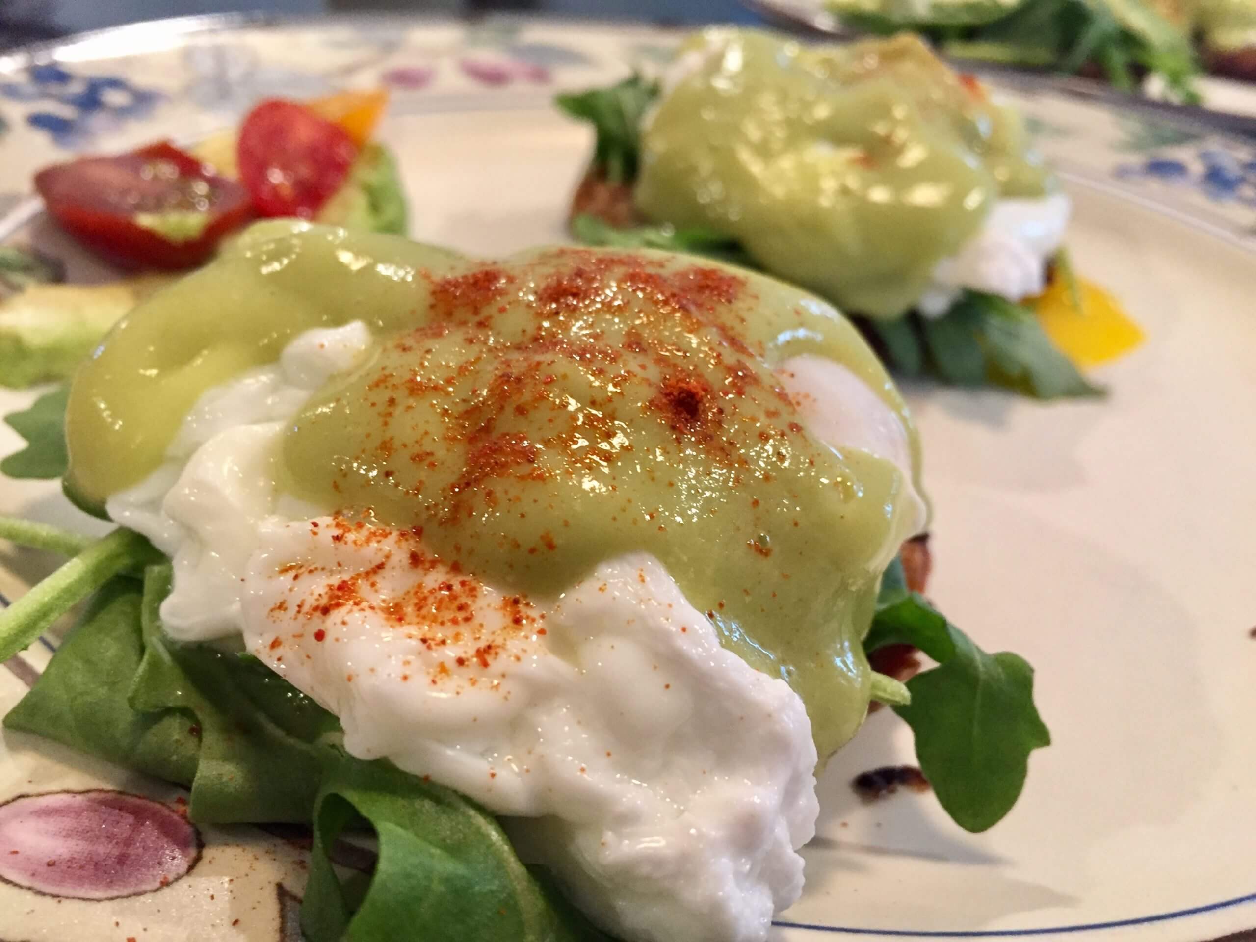I like to enjoy myself when I go out, so at home I cook on the healthier side and make modifications to recipes whenever possible. Eggs Benedict got a Mandy Meal Makeover over the recent holiday vacation. In place of the traditional hollandaise, I decided to make a version based with avocado, and the outcome was a significant decrease in the calories from the original. Avocados provide a high source of monounsaturated fats (those “good fats” you hear so much about), vitamin E, B-vitamins, potassium, and antioxidants. Plus the fat content in avocados help absorb fat-soluble nutrients, including vitamin A for healthy cell growth. They’re a great swap for high saturated fat ingredients in recipes, including butter, mayo, or cream cheese. It’s highly likely you’ve had brownies, ice cream, or frosting made with avocado and didn’t even know it.