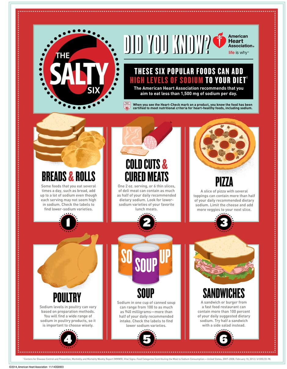 Processed Foods: If it comes in a can, box, frozen dinner, or from the deli counter, that food is guaranteed to be full of sodium. This is because sodium helps preserve foods (helpful in the days of the Mayflower, but not so much now). Processed foods account for 75% of our sodium consumption.