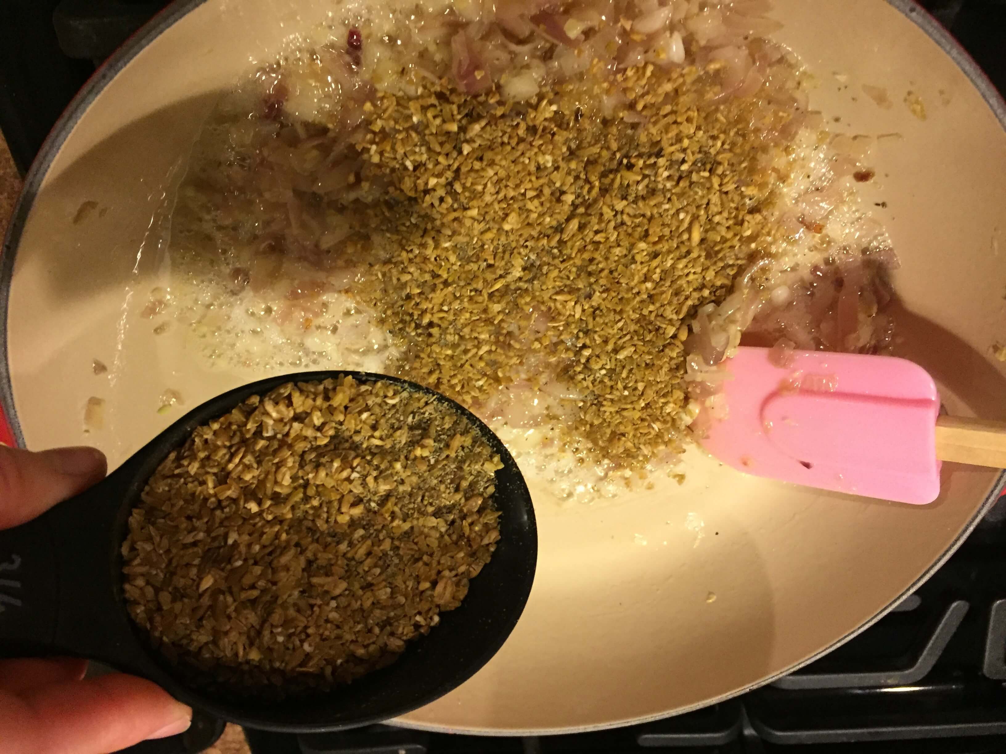 - Add the Freekeh to the pan, and stir to coat with oil & butter. Cook for 1-2 minutes.