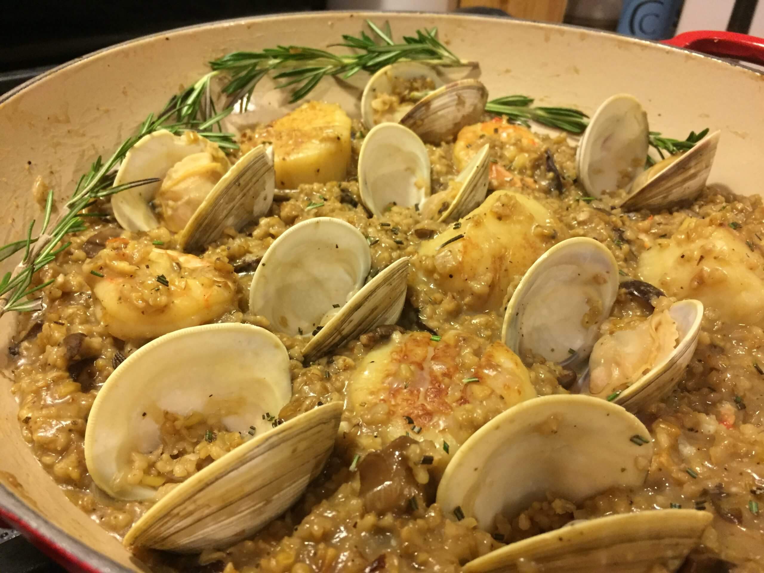 - After the last addition of stock has been absorbed, remove the pan from the heat, add the sauteed mushrooms, parmesan cheese and chopped rosemary to the Freekeh, and stir to combine. Add the clams back into the mixture and serve.