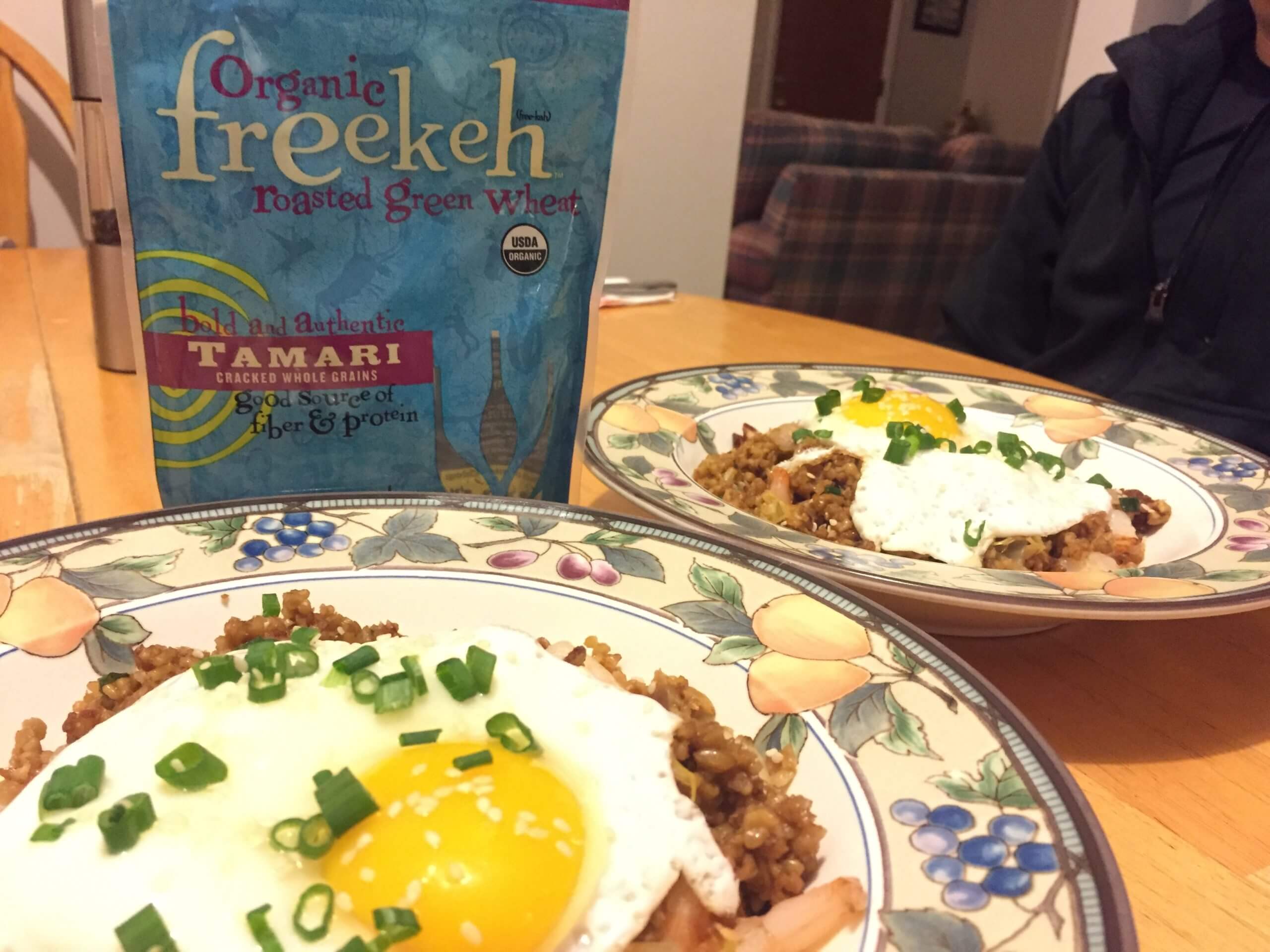 While this is a fairly quick meal to put together on a weeknight, there is one caution- the freekeh must be cooked at least 1 day in advance.  This allows the freekeh to stiffen a little, which helps create a crunchier texture.  The egg is preferably done sunny-side up to create a runny yolk that acts as a sauce.  If you would prefer, the egg can also be prepared over-easy.
