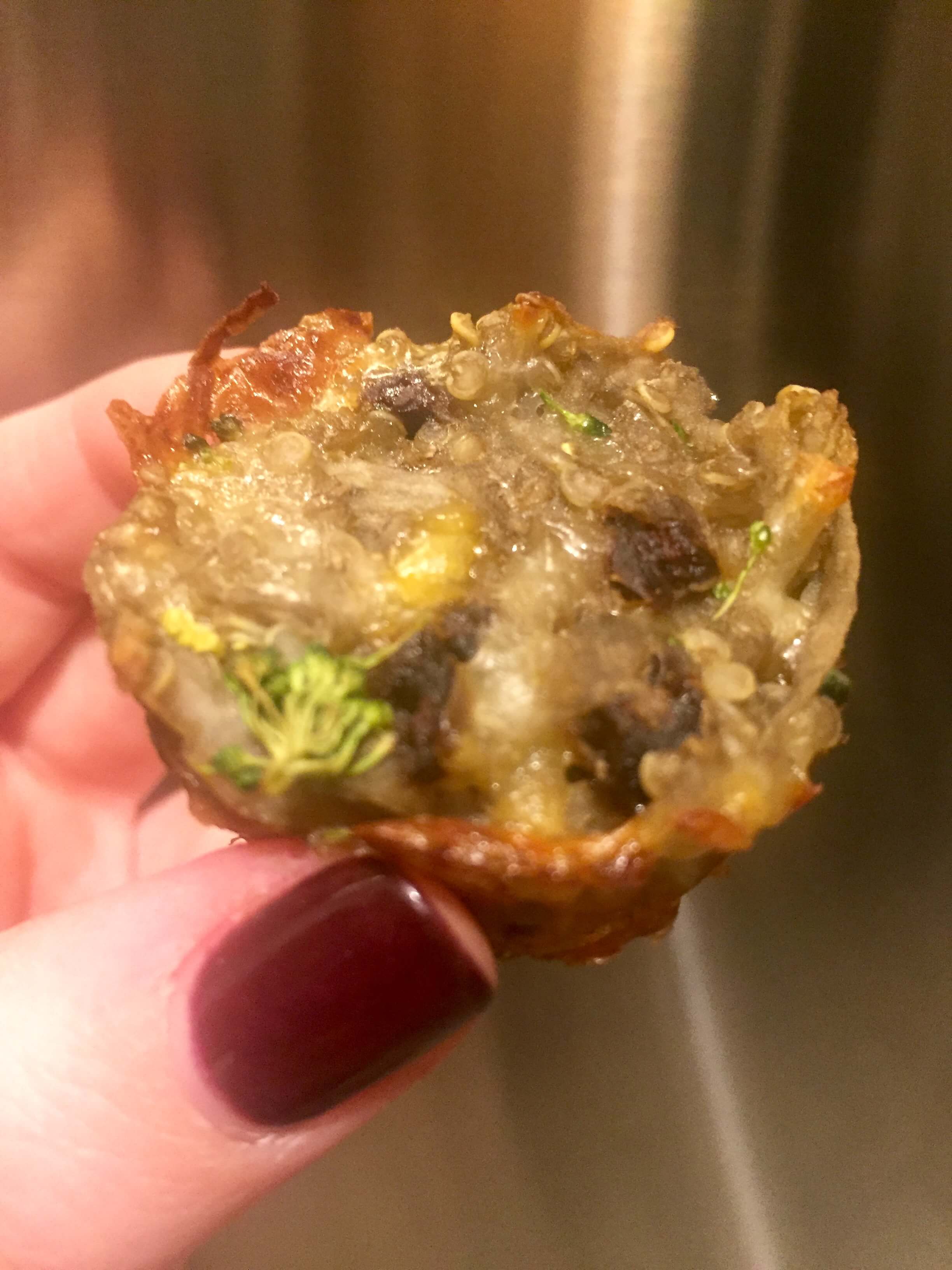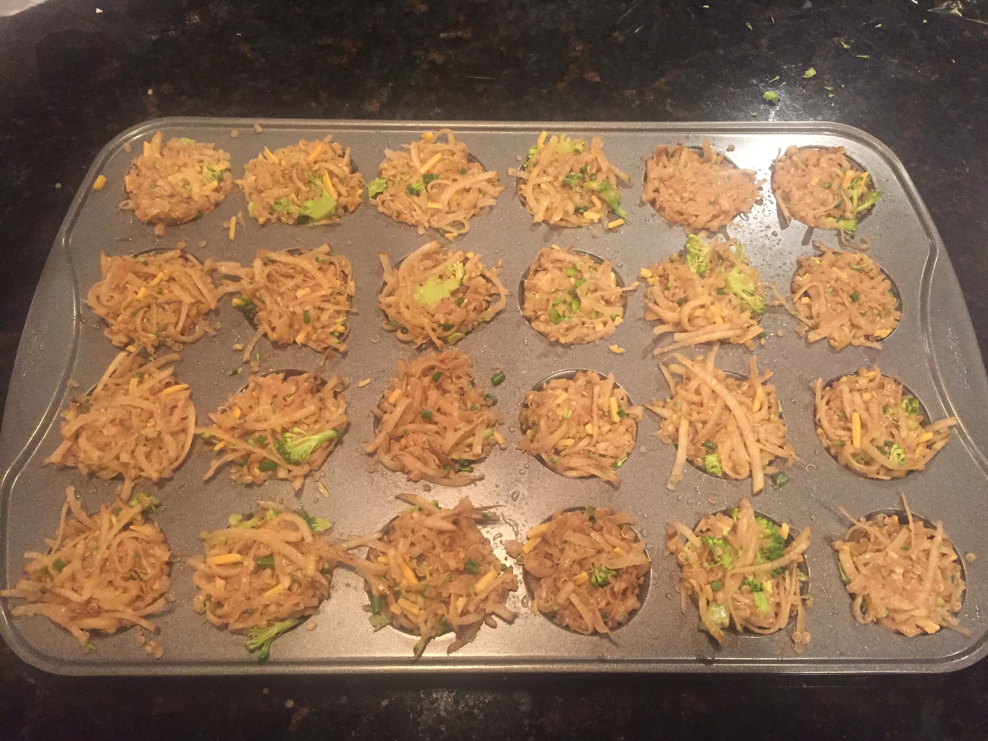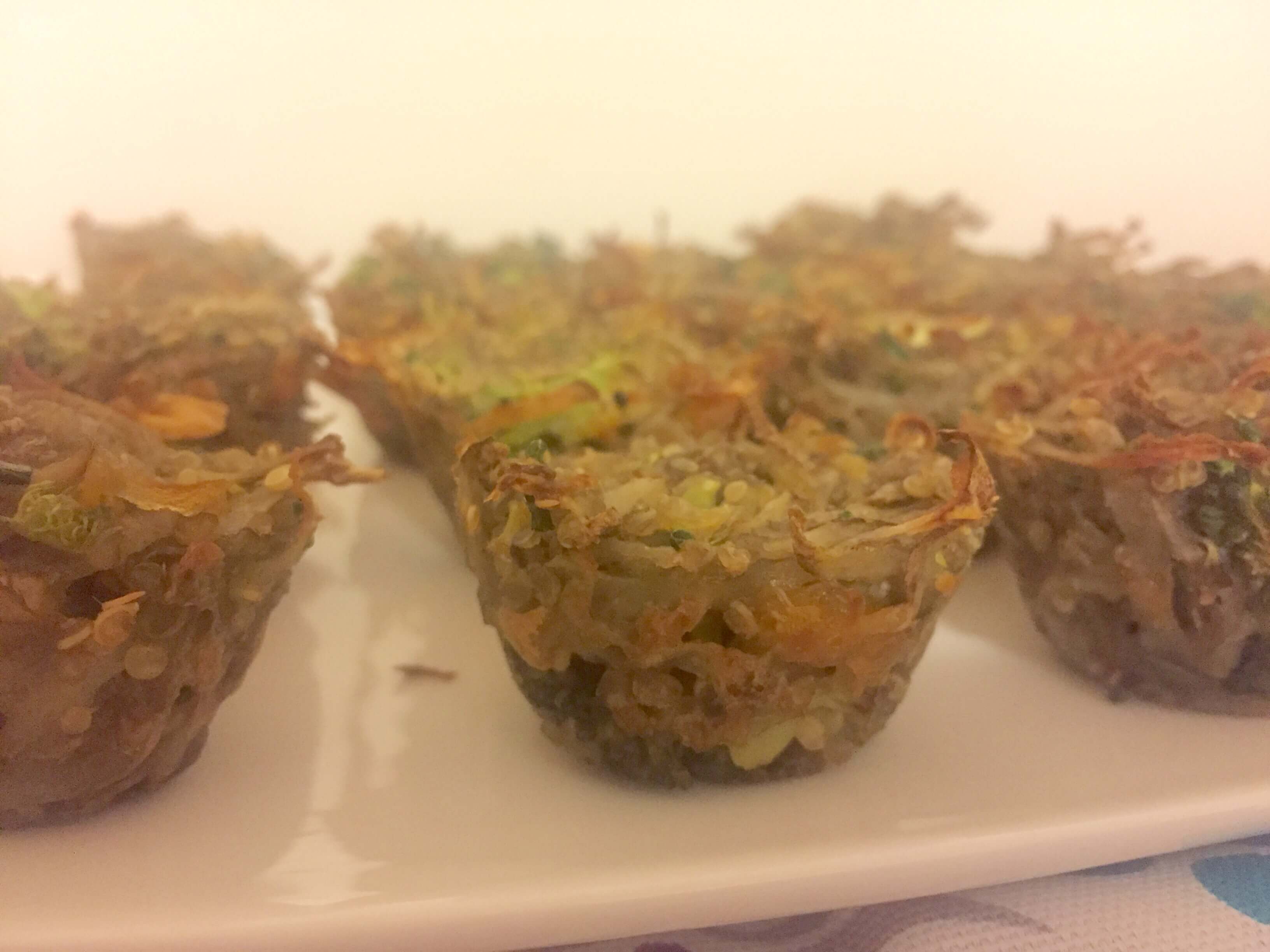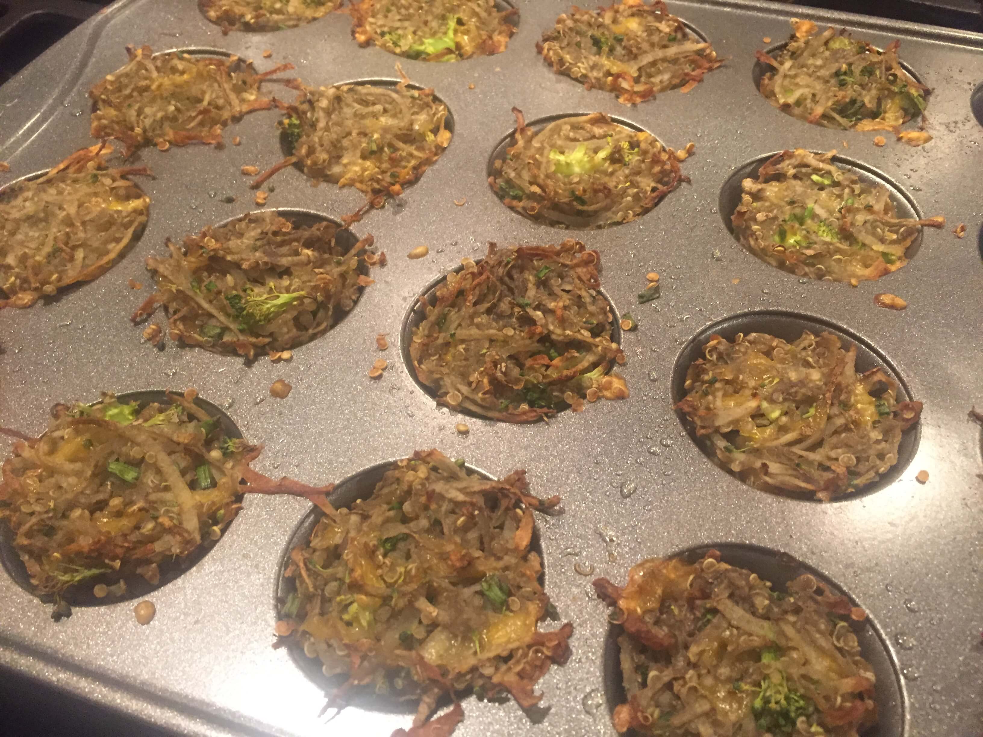 My Mini Broccoli Cheddar Potato Cups are a play on another breakfast favorite of my clients: Egg Muffin Cups.  These use shredded potato to create a crispy texture. Quinoa is added in place of flour to help bind the cups together with the help of some egg and cheddar, making them a great gluten-free option as well.  I’m not a bacon fan, but to add that salty flavor, I used smoked julienned sundried tomatoes.  Adds way less saturated fat and sodium to them mix while still giving that smokey flavor.  Once you bake the cups, allow them to cool for 5 minutes before enjoying so they have a chance to firm up.