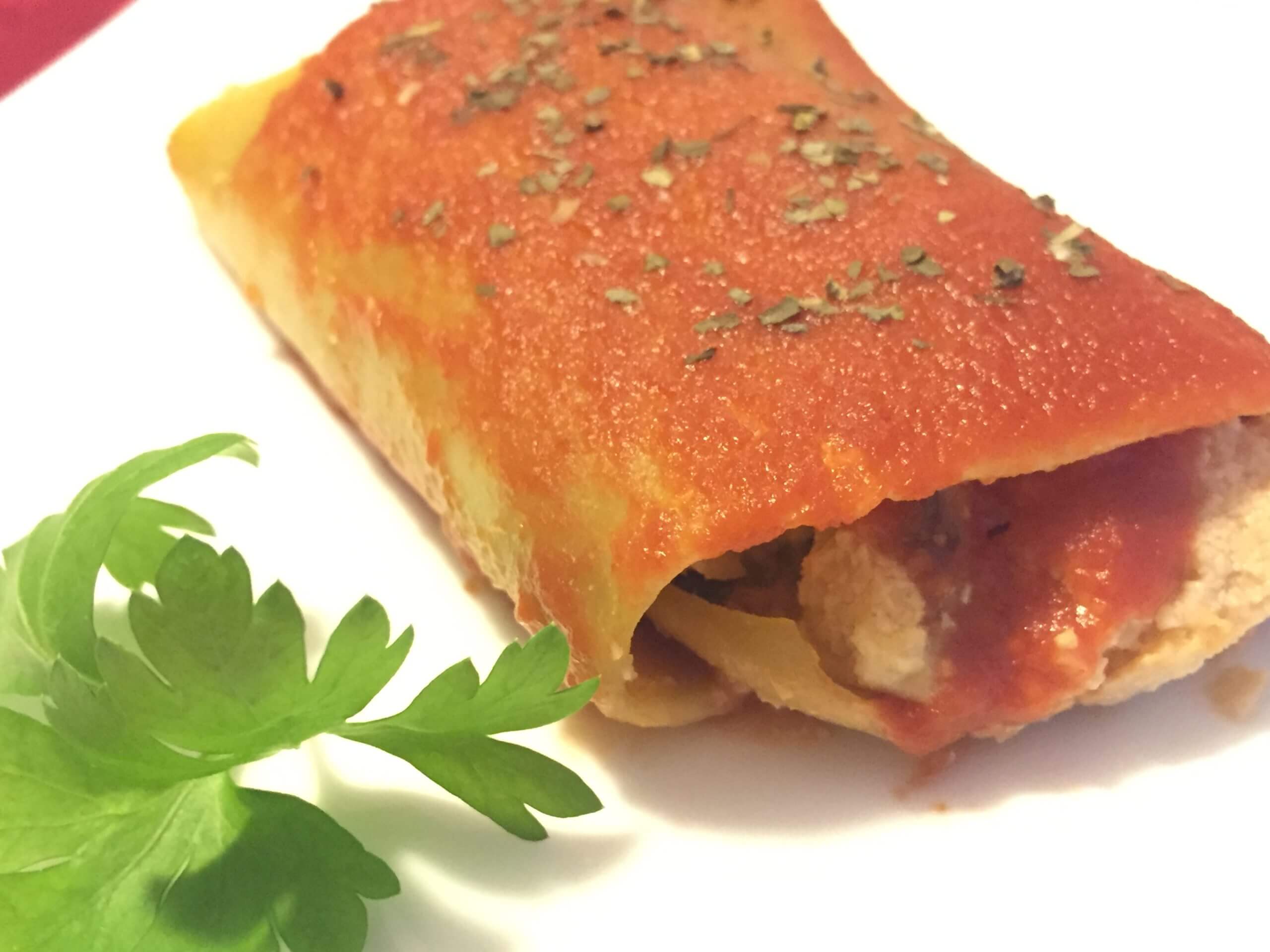 Once the cashew ricotta was made, the veggies were mixed in.  To prep the pasta, I placed the lasagne sheets one at a time in very hot water that had previously been boiled, and soaked them 2-3 minutes to get them softened.  Using tongs to remove the lasagne sheets from the water, run briefly under cold water to stop the cooking process, and place on a flat surface.  Spoon 2TB of the ricotta veggie filling to the far left of the lasagne sheet, and then roll up, placing seam side down on a pan lined with non-stick foil or parchment paper.  Spoon marinara sauce over the top,  sprinkle with some basil, and into the oven these go for 15 minutes.